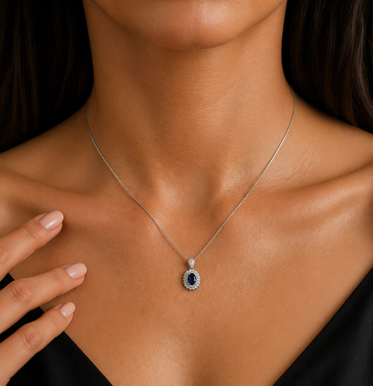 Collana pendente con zaffiro ovale ct 0,97 e diamanti ct 0,45 in oro bianco 18kt (750)