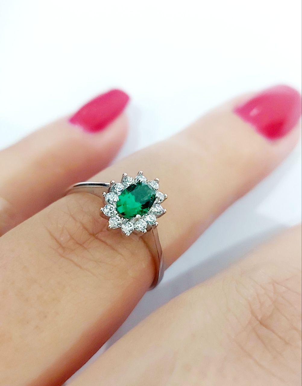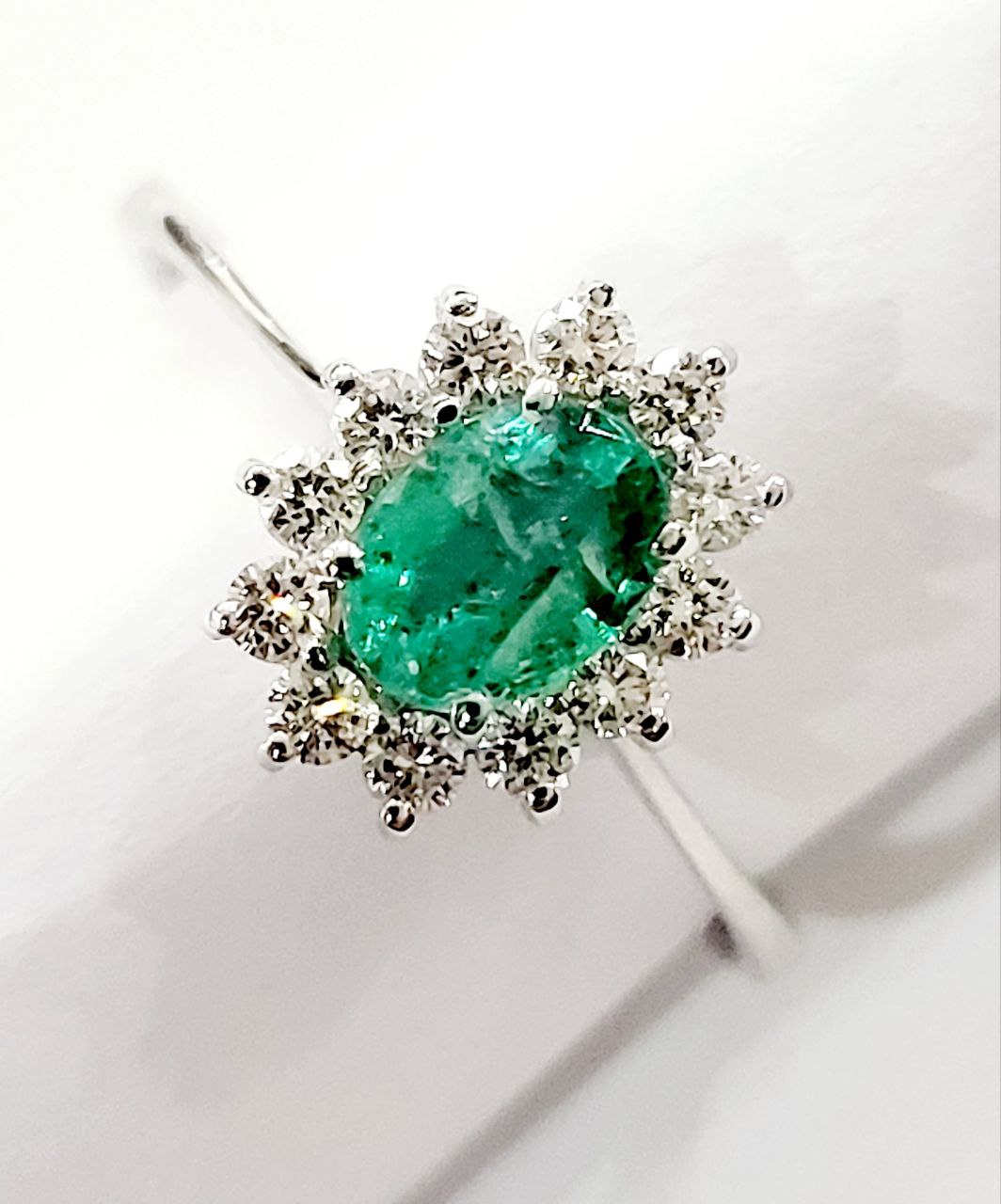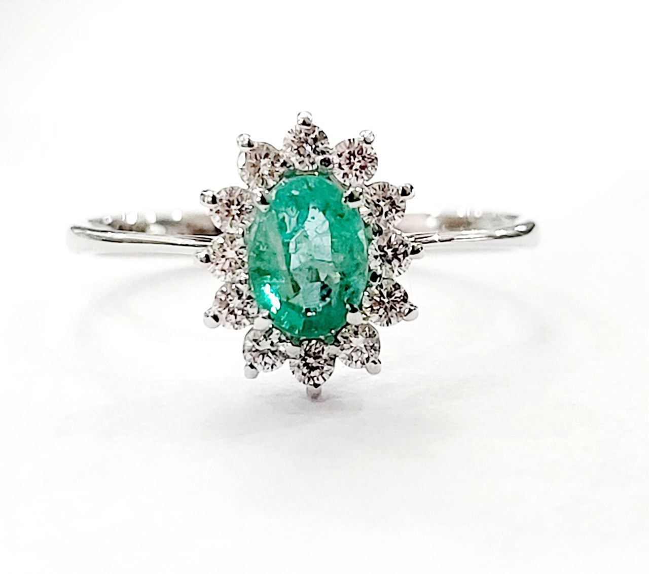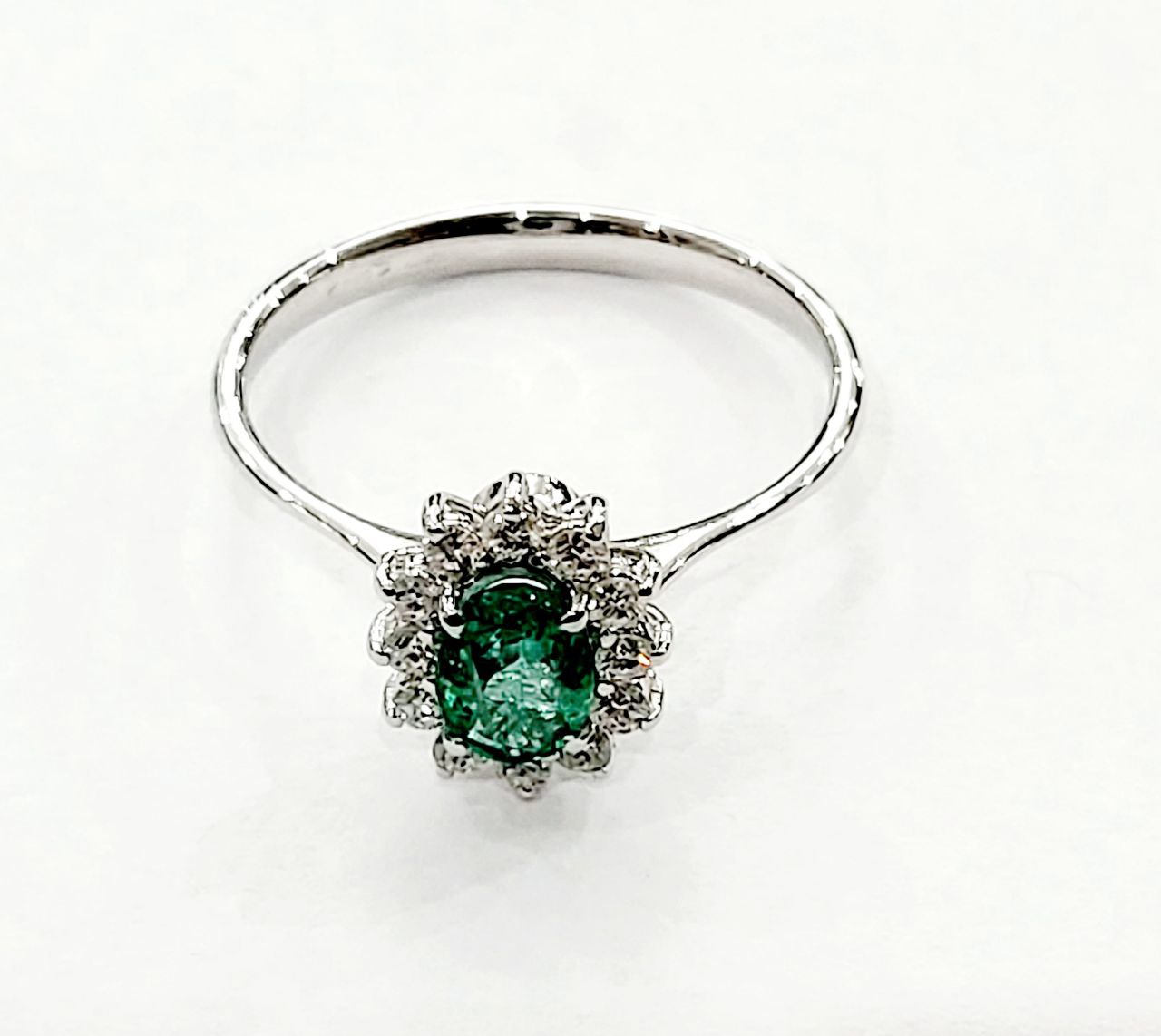 Anello con Smeraldo ovale 0,55 ct contornato da diamanti 0,20 ct in Oro Bianco 18kt (750) – 2,50 gr circa