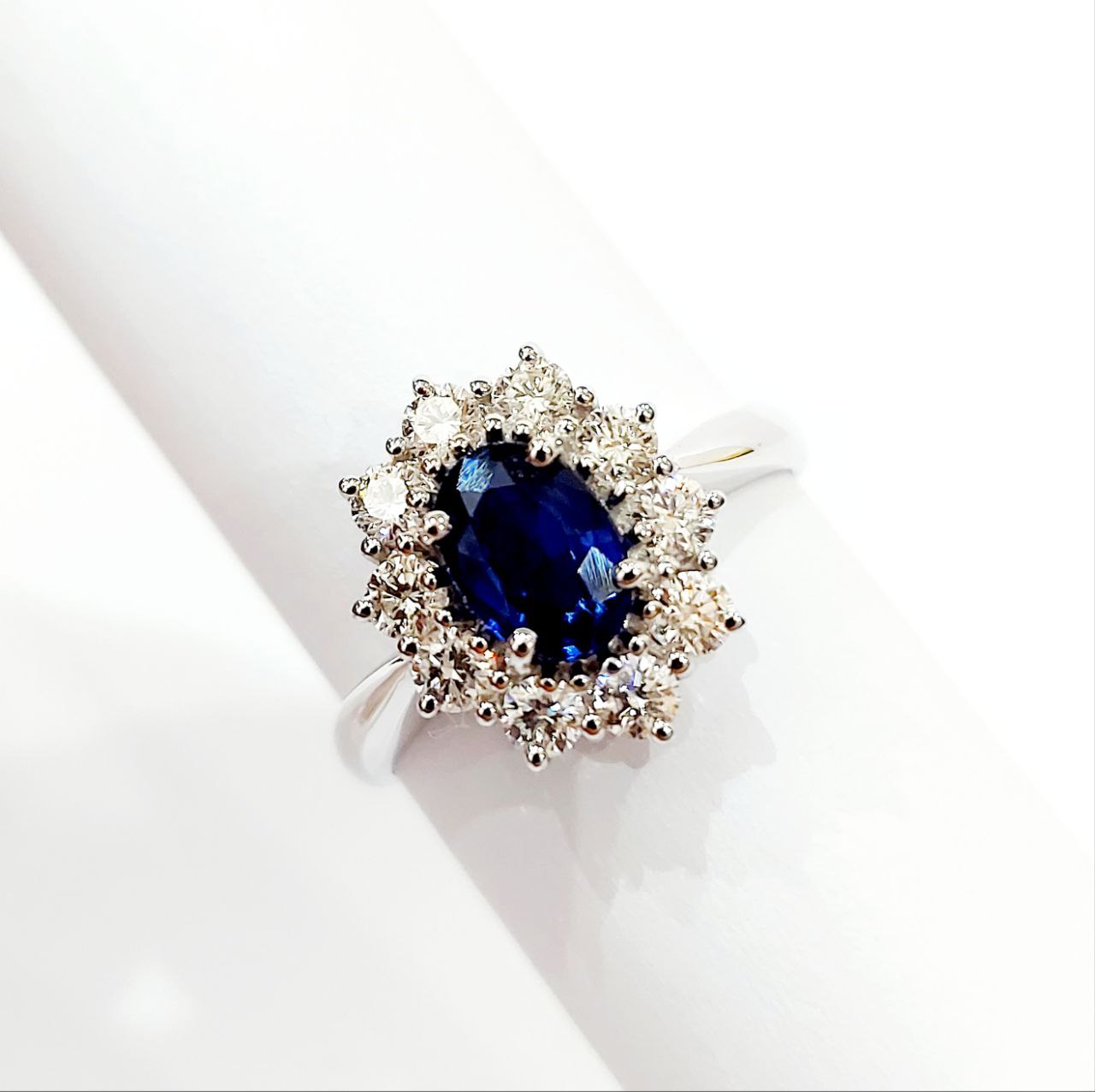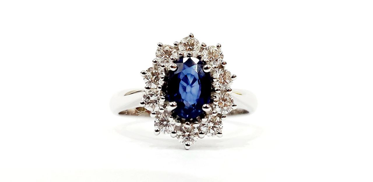Anello fantasia con Zaffiro ct 1,40 e contorno di Diamanti ct 0,91 in Oro Bianco 18kt (750)