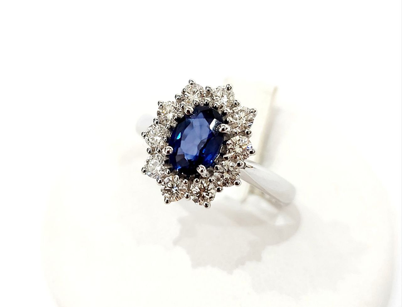 Anello a fantasia Oro Bianco con Zaffiro ovale 1,40 ct e Diamanti 0,91 ct – Grammi 4,00 – 18 kt – (750)