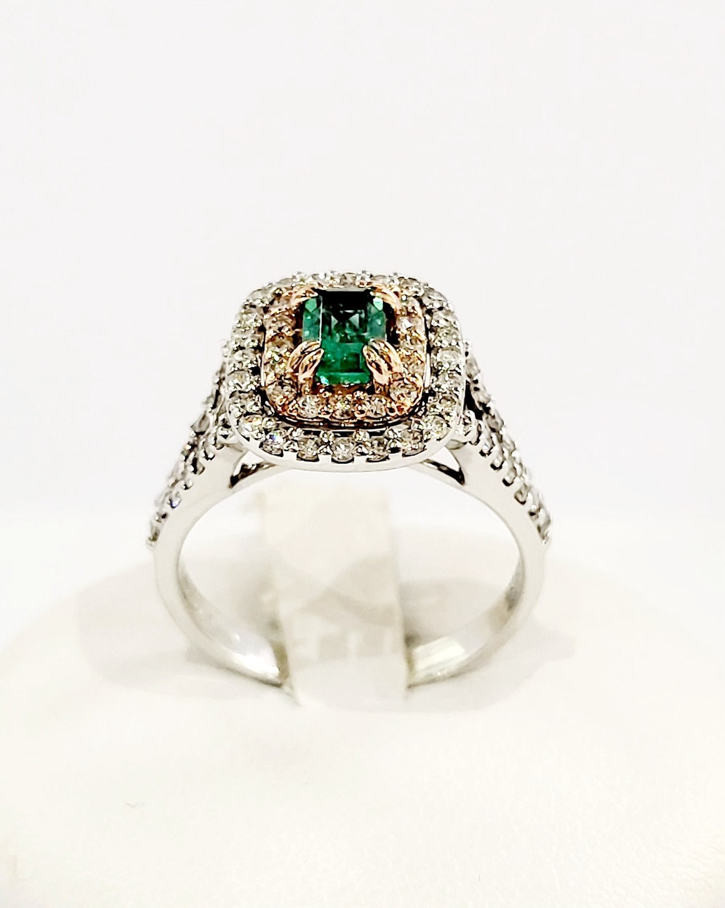 Anello fantasia in Oro Bianco e Oro Rosa con Diamanti ct 0,80 e Smeraldo ct 0,50 con certificazione gemmologica Gem Tech 18 kt (750)