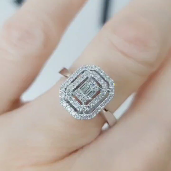 Anello da Donna rettangolare impreziosito da diamanti bianchi naturali taglio baguette e taglio brillante 0.60 ct lavorato in oro bianco 18 kt\750Â