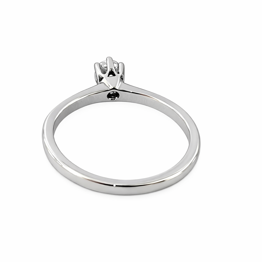 Anello Solitario modello Tiffany con Diamante ct 0,10 incastonato in 6 griffe lavorato in Oro Bianco 18kt-750 - con certificato gemmologico