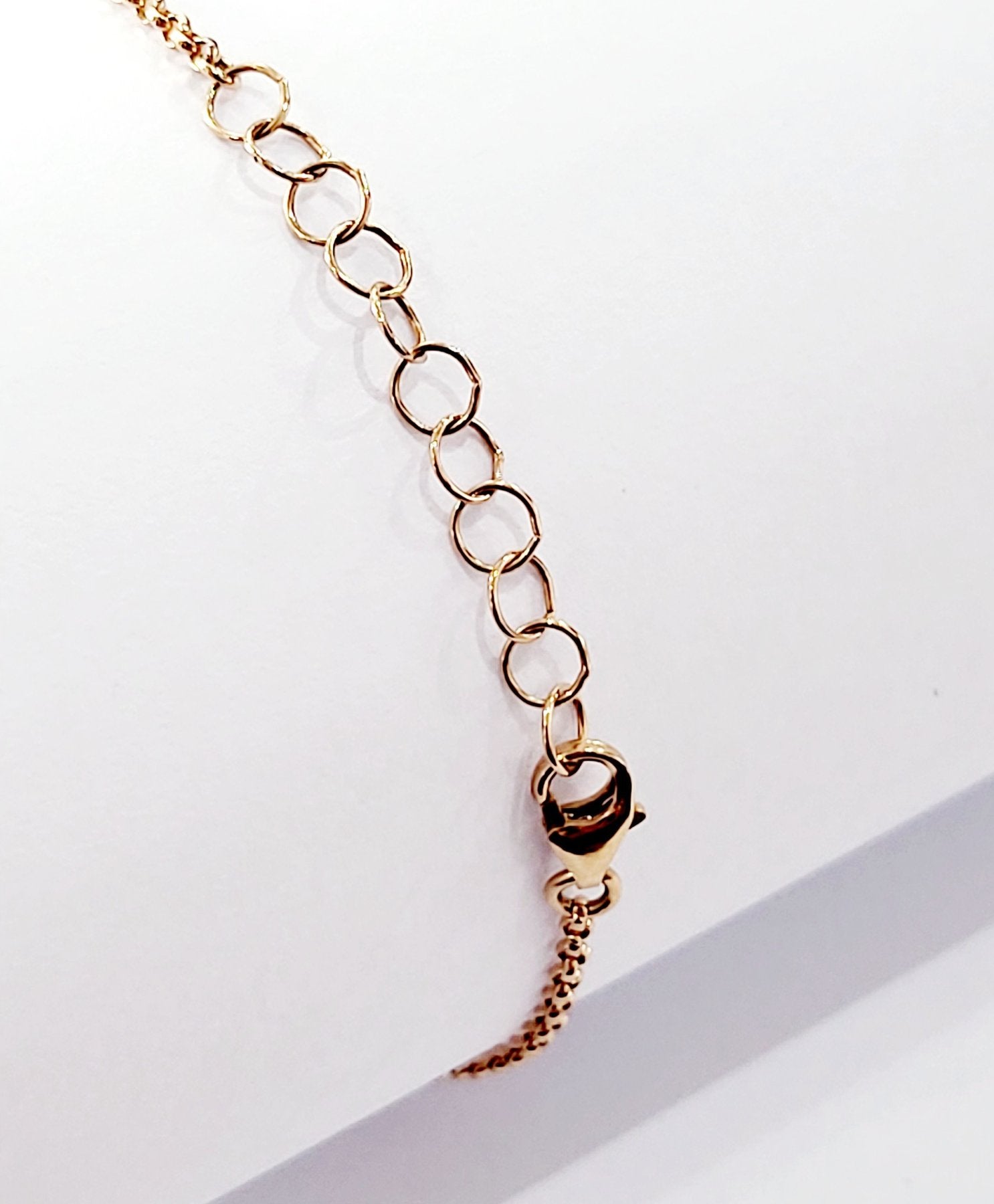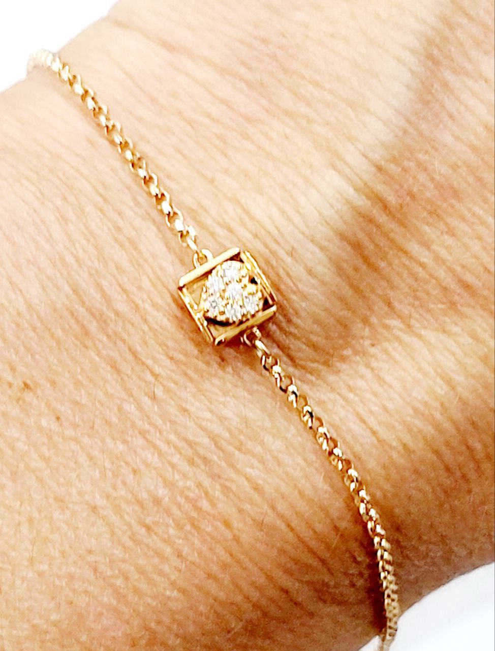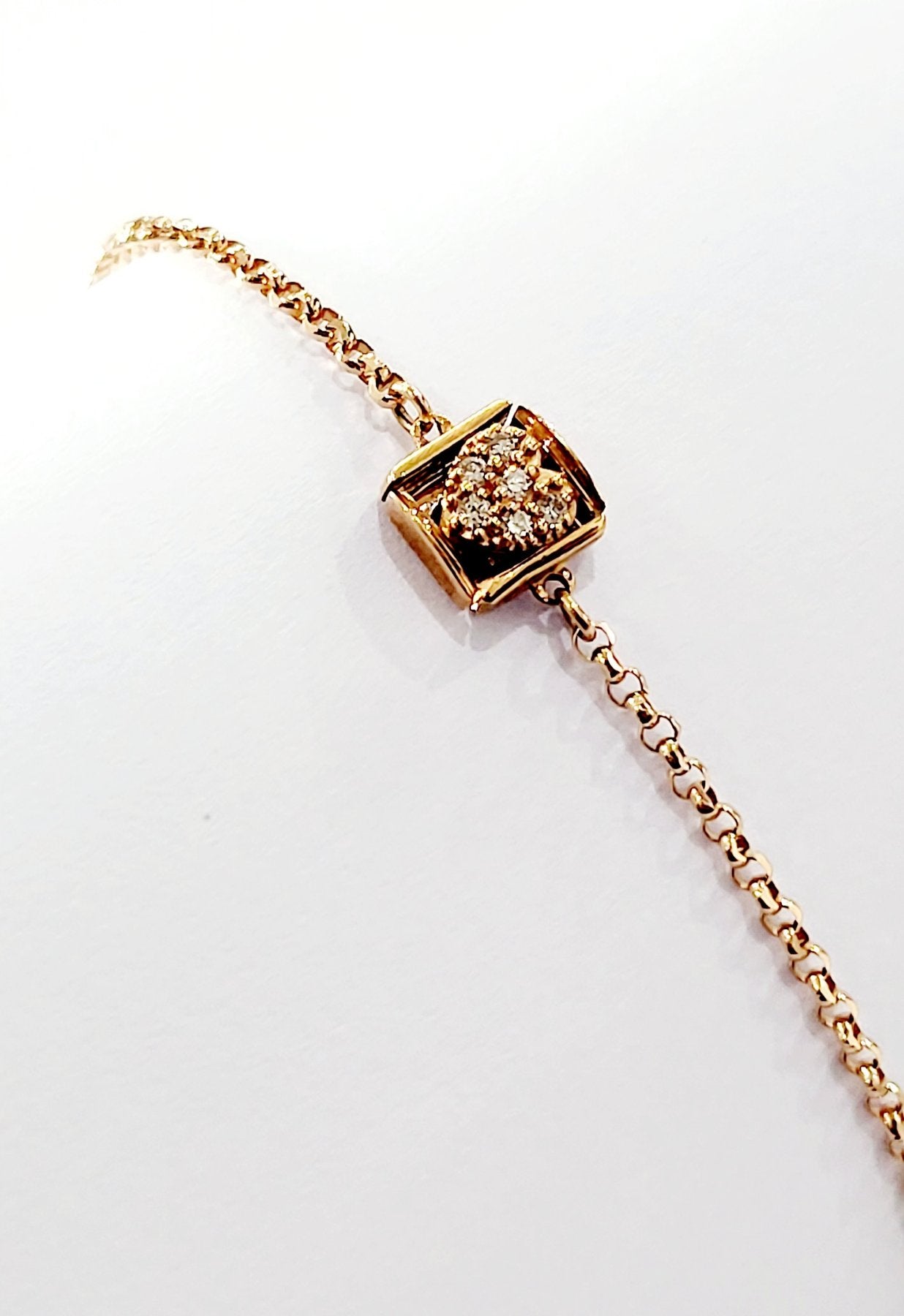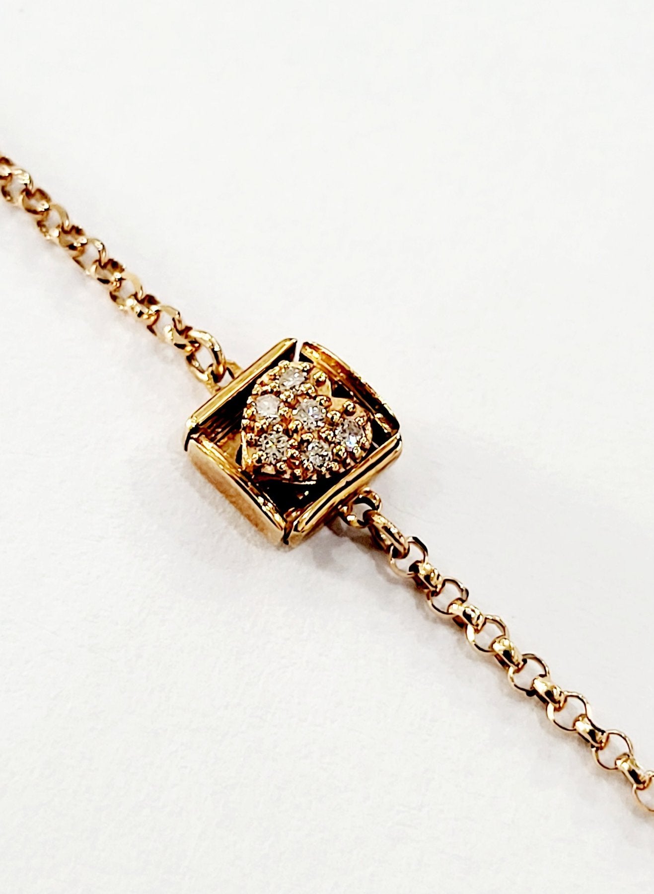 Bracciale dal design elegante con catena che passa attraverso la sezione centrale che contiene il ciondolo a cubo di 6 mm incastonato con cuore e Diamanti in Oro Rosa 18kt-750/1000- 2 Grammi firmato ( Tramontano)