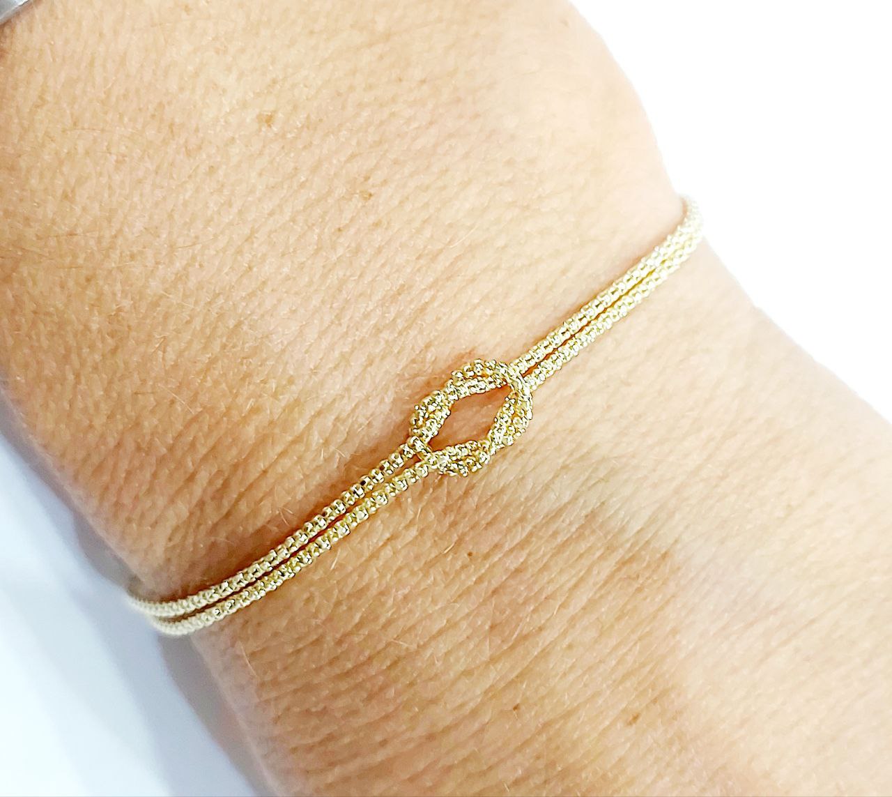 Bracciale arricchito da una raffinata maglia a cordoncino a due fili, intrecciati al centro a formare un nodo, simbolo di legame.