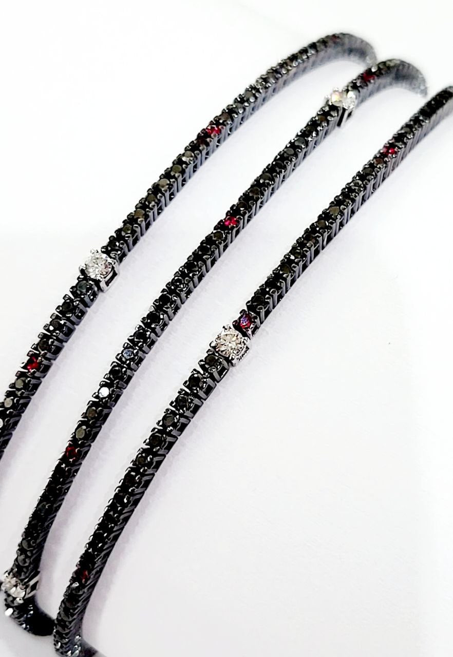 Bracciale Tennis a tre fili con Diamanti Neri,Bianchi e Rubini in Oro Bianco Brunito 18kt-750