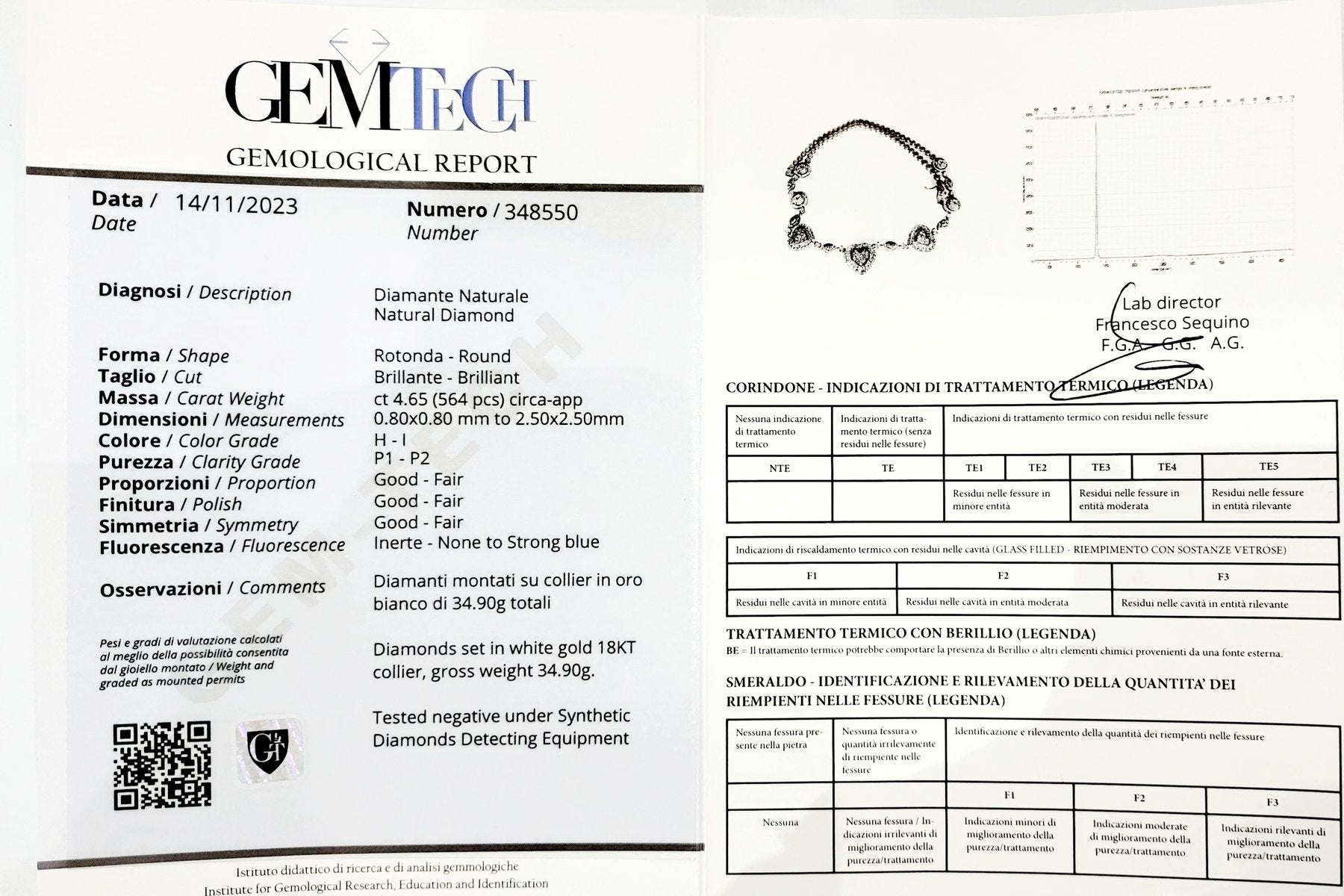 Collana a cuore con Diamanti ct 4,65 in Oro Bianco con certificazione gemmologica Gem Tech 18 kt -750