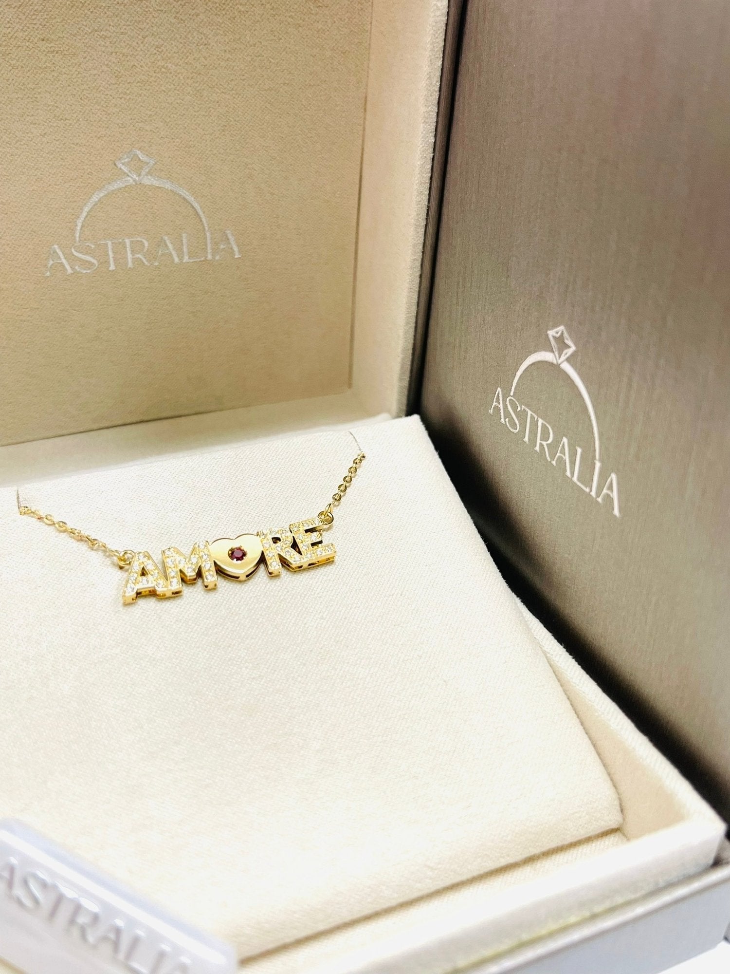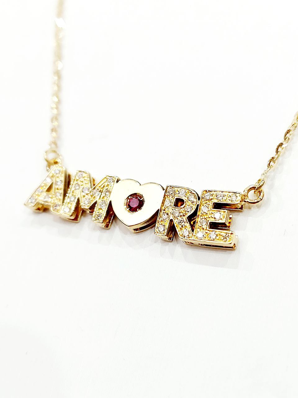Collana con scritta amore con cuore firmata “Astralia” con Diamanti e Rubino lavorata in Oro Giallo – 18 kt – ( 750 )