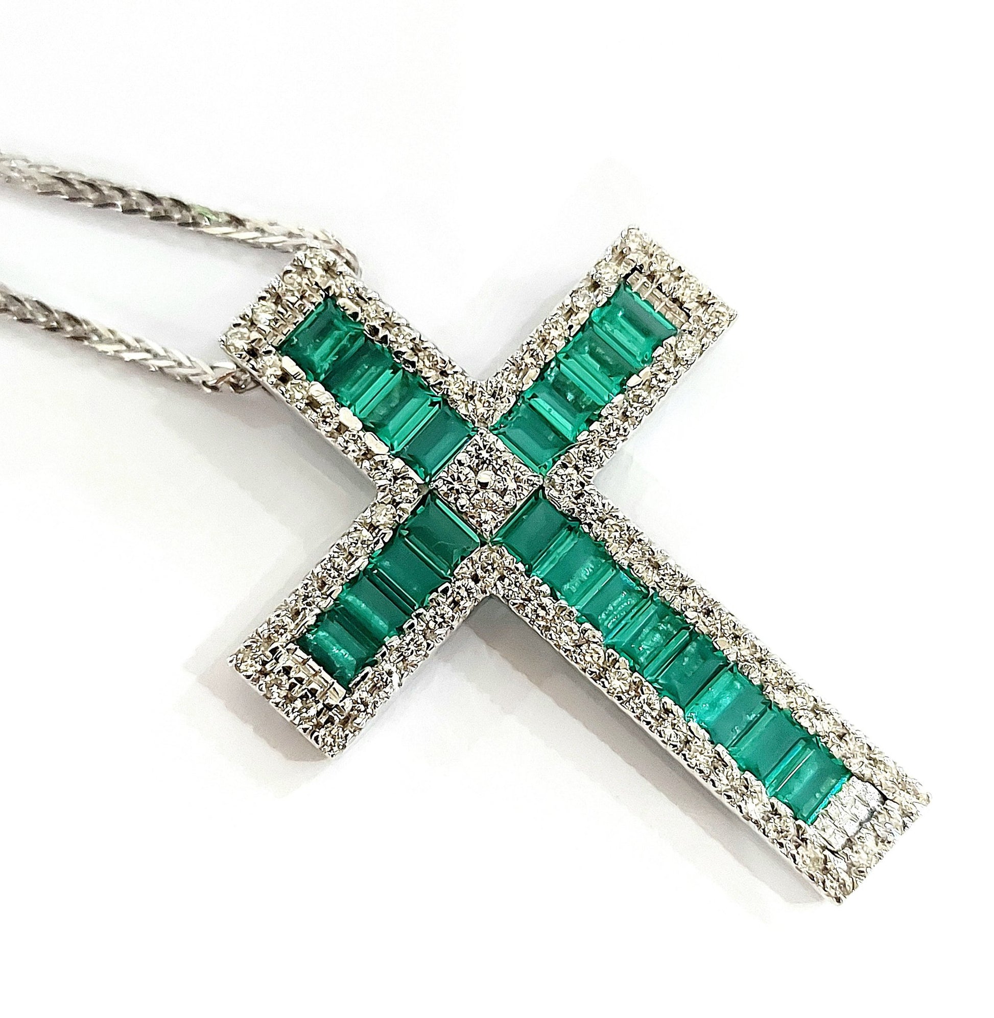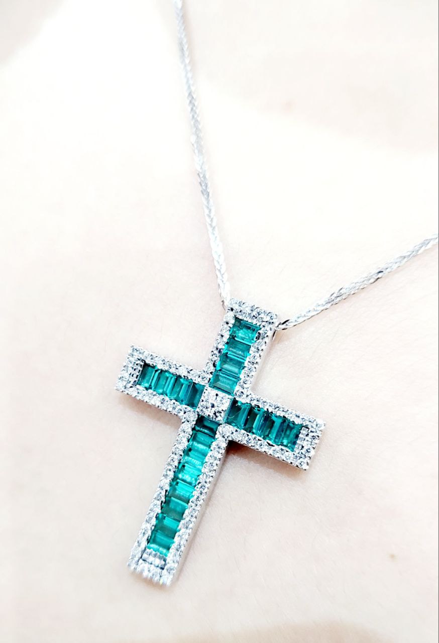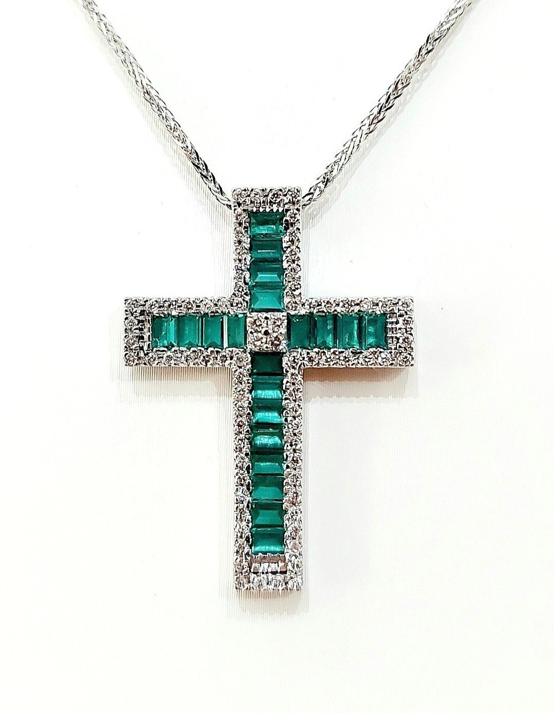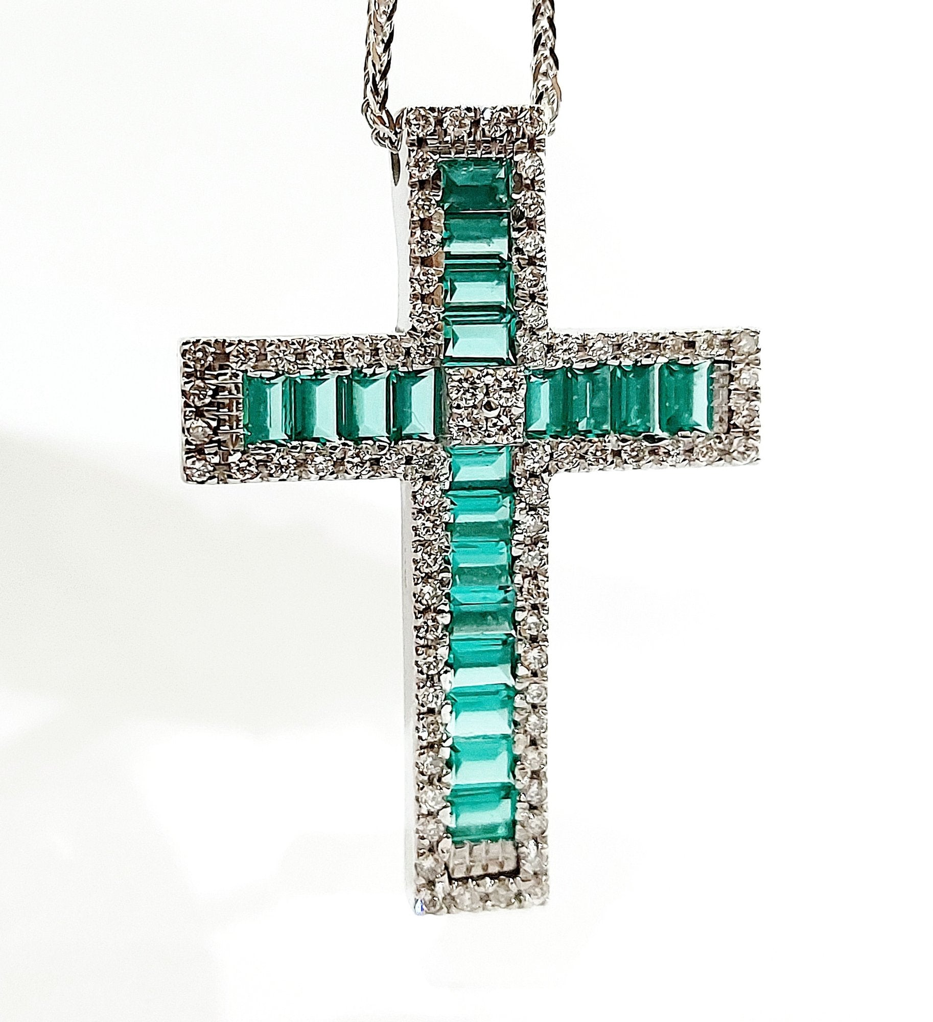 Collana con pendente a forma di Croce lavorata in Oro Bianco con 18kt-750 con Diamanti taglio brillante Ct 0,90 e Smeraldi Baguette Ct 2,10 - Grammi 7,40