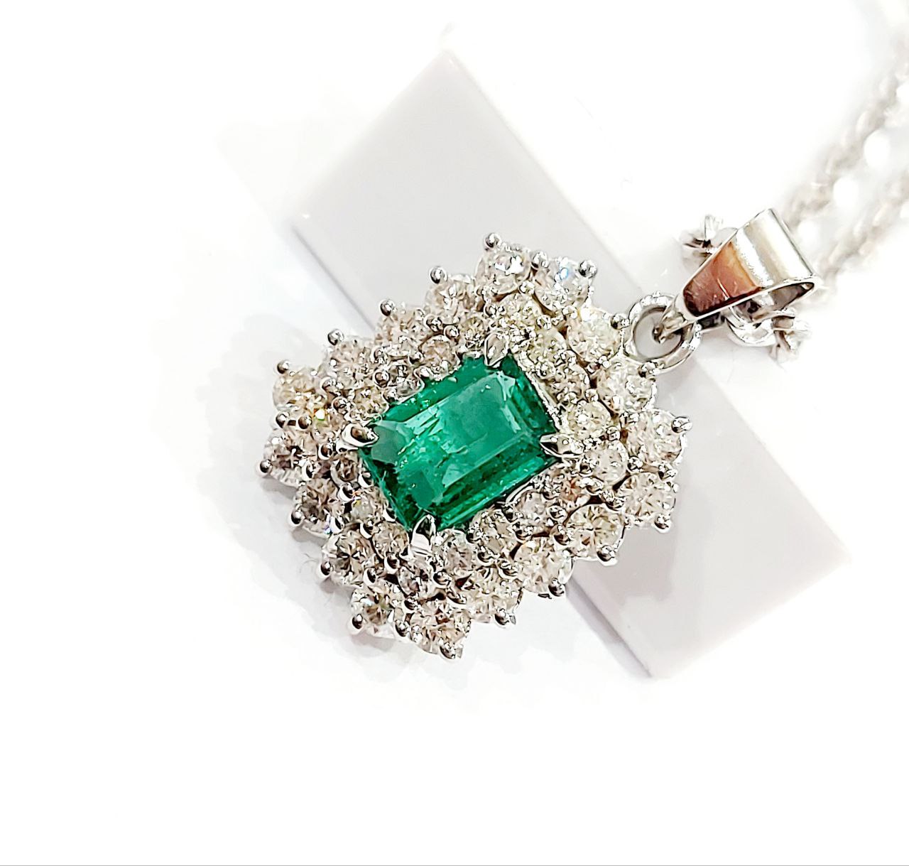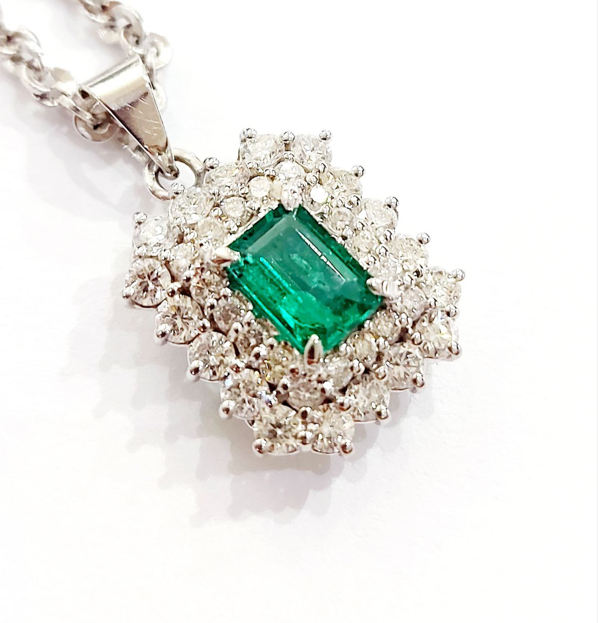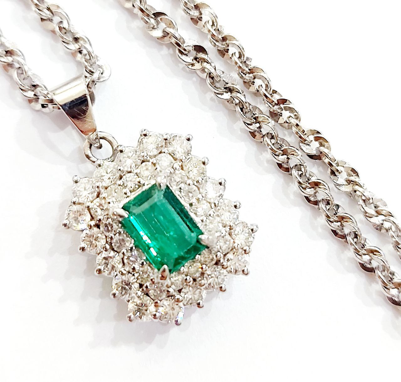Collana con pendente con Smeraldo taglio Ottagonale ct 0,85 e Diamanti taglio brillante ct 1,45 Oro bianco 18kt-750 GEM-TECH