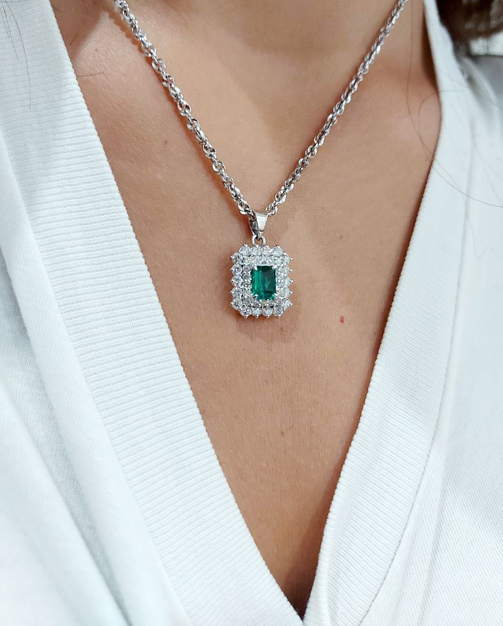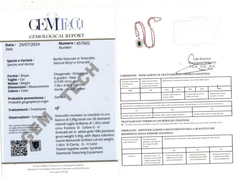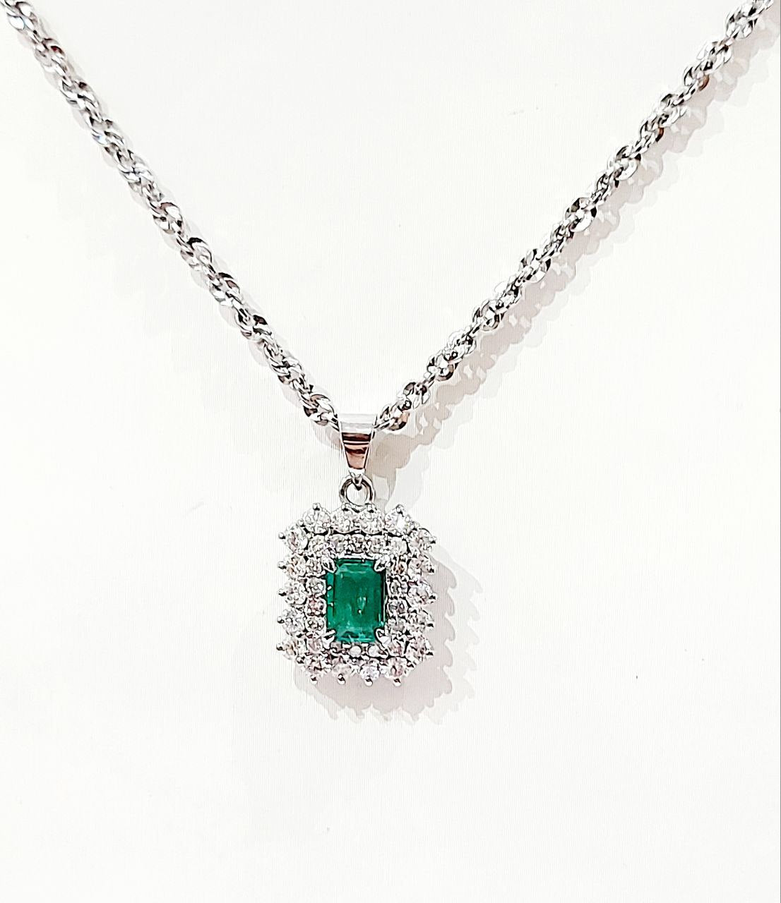 Collana con pendente con Smeraldo taglio Ottagonale ct 0,85 e Diamanti taglio brillante ct 1,45 Oro bianco 18kt-750 GEM-TECH
