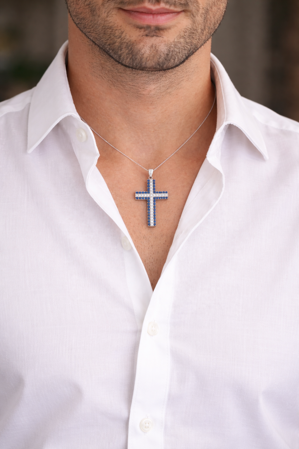 Collana con pendente a forma di Croce incastonata con Zaffiri ct 0.69 e Diamanti ct 0,39 lavorato in Oro Bianco – 18kt – 750