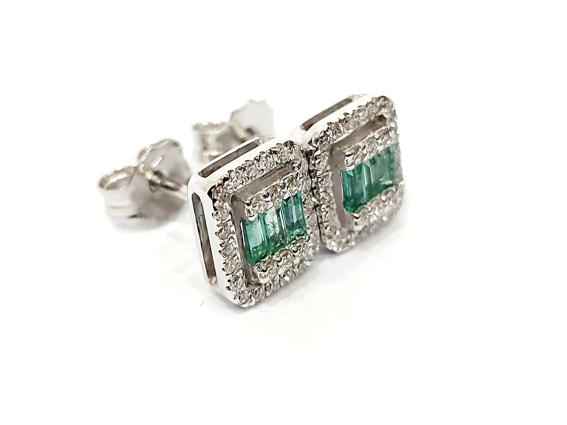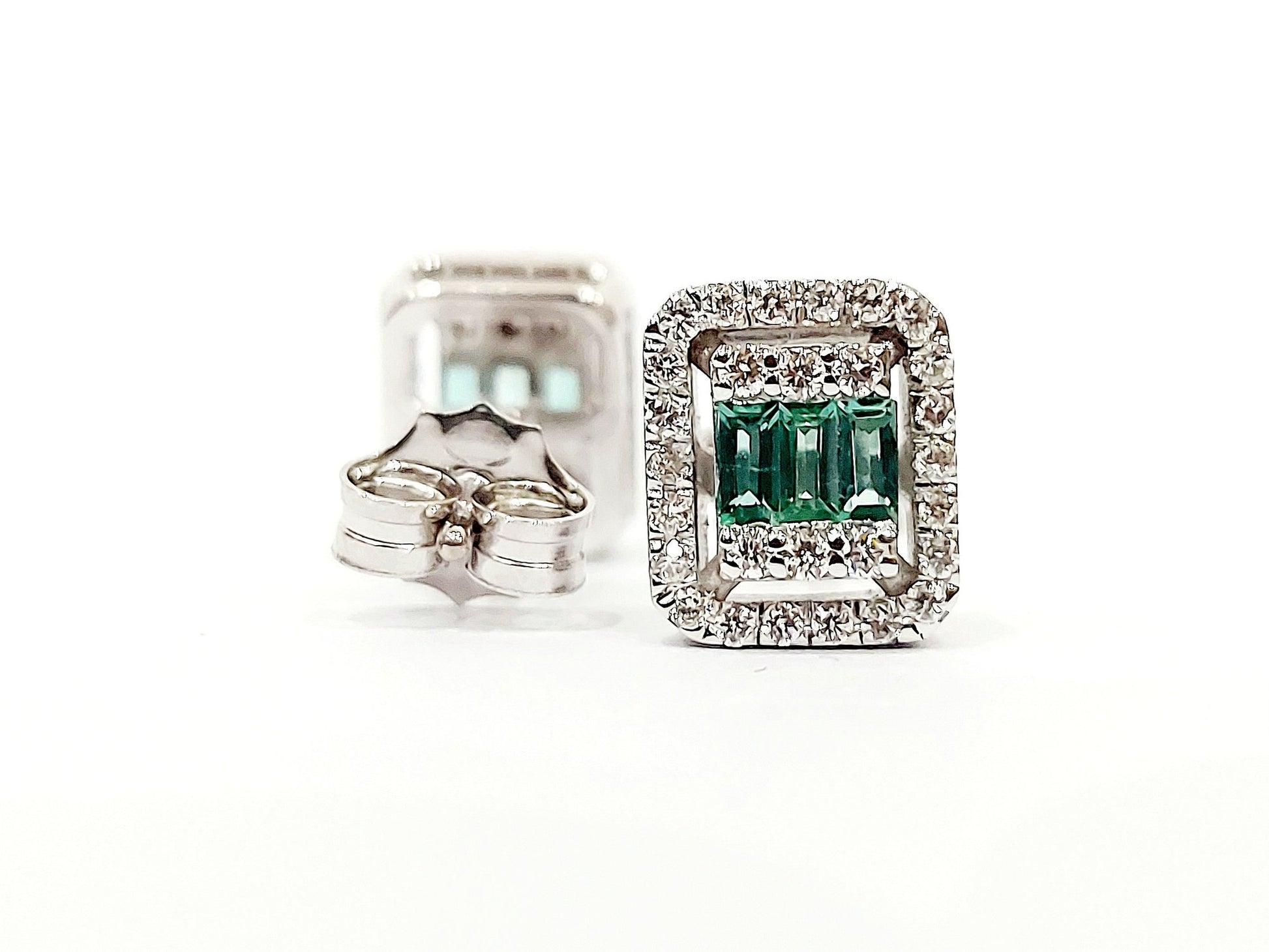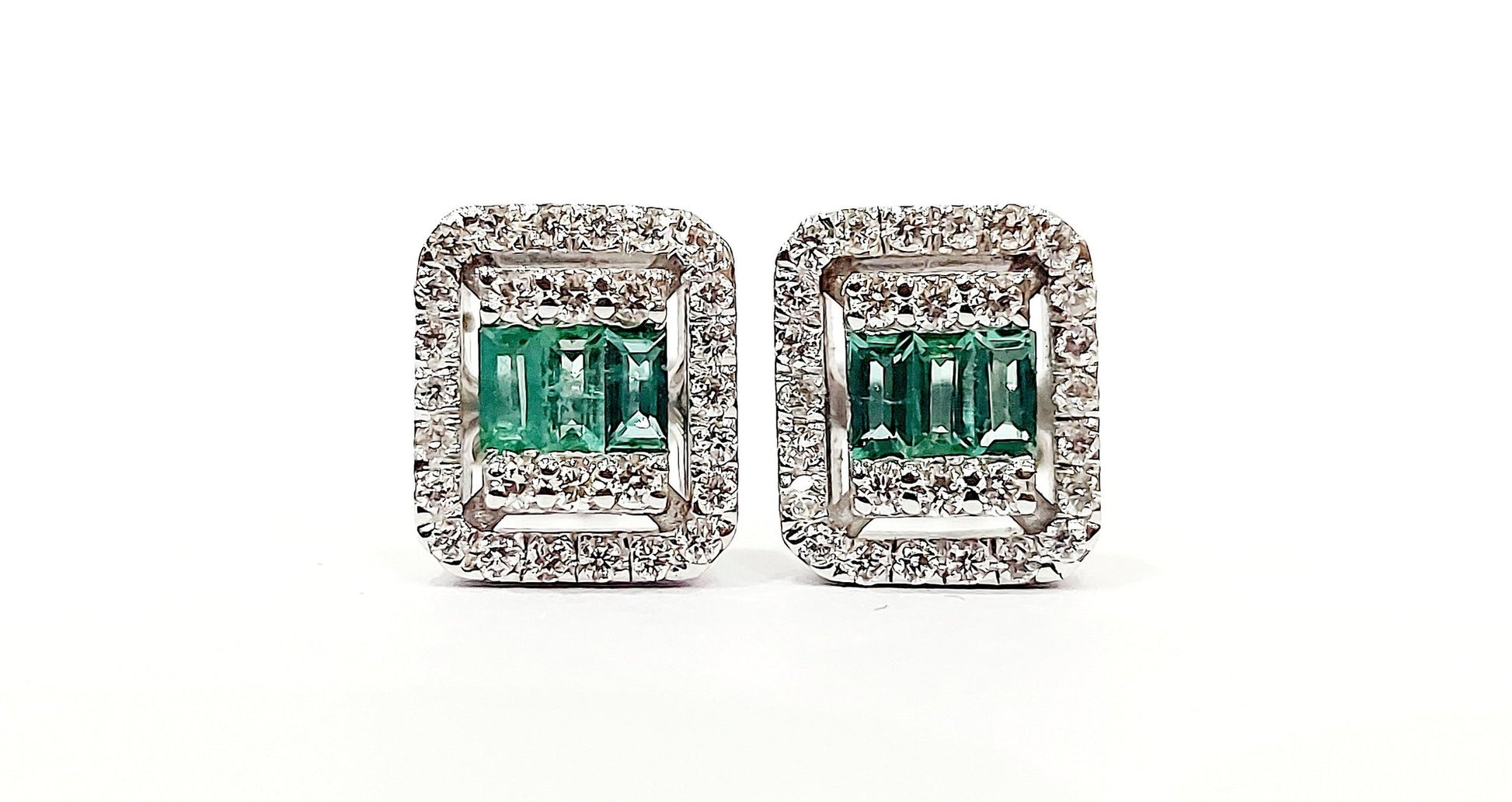 Orecchini firmati “Astralia” con Diamanti 0,56 ct e Smeraldi baguette 0,36 ct in Oro Bianco – 18kt – ( 750 ) – 2,60 gr